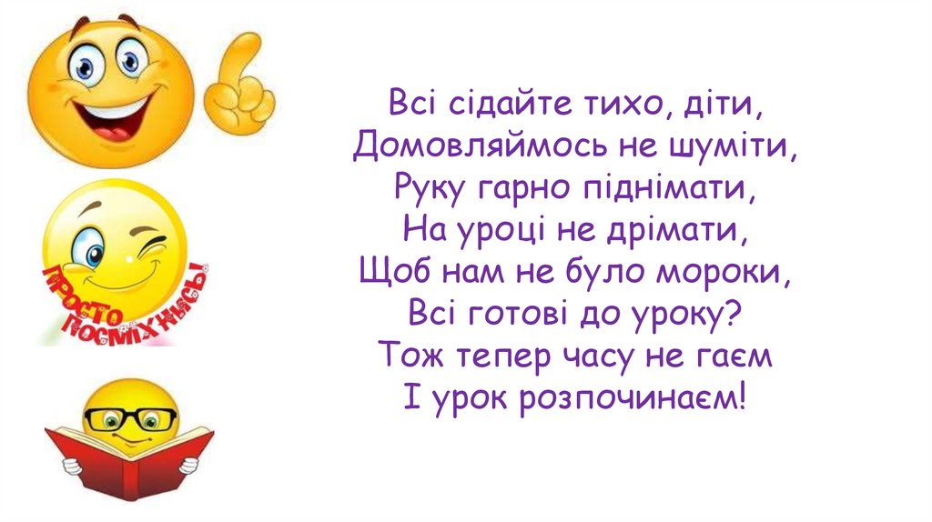 Всі сідайте тихо, діти,Домовляймось не шуміти,