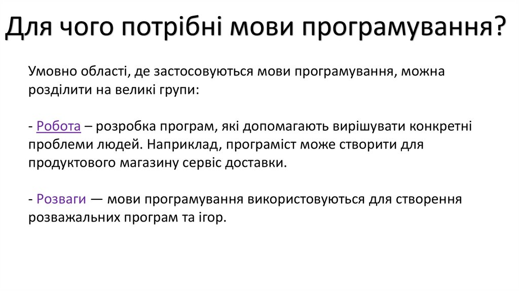 Для чого потрібні мови програмування?Умовно області, де застосовуються мови програмування, можна
