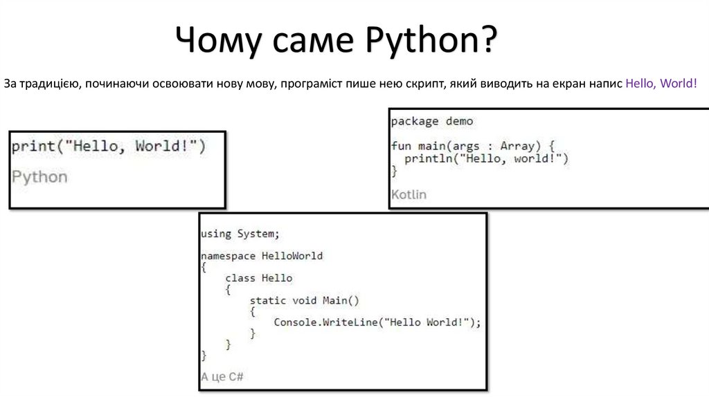 Чому саме Python?За традицією, починаючи освоювати нову мову, програміст пише нею скрипт, який виводить на екран напис Hello, World!