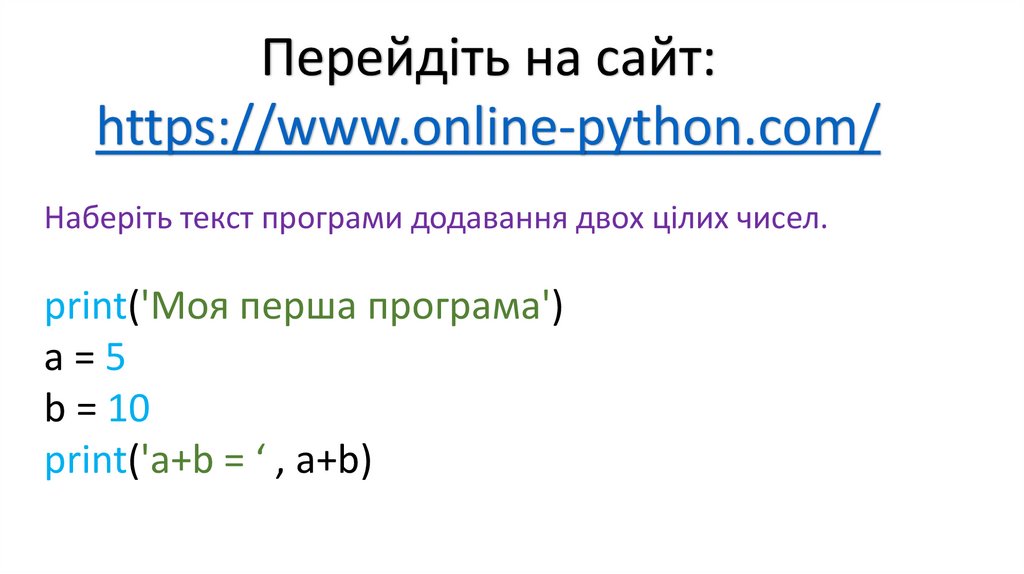 • Складіть програму, яка обчислює значення виразу 5*a99/b+4*c, якщо a=6, b=33, c=121