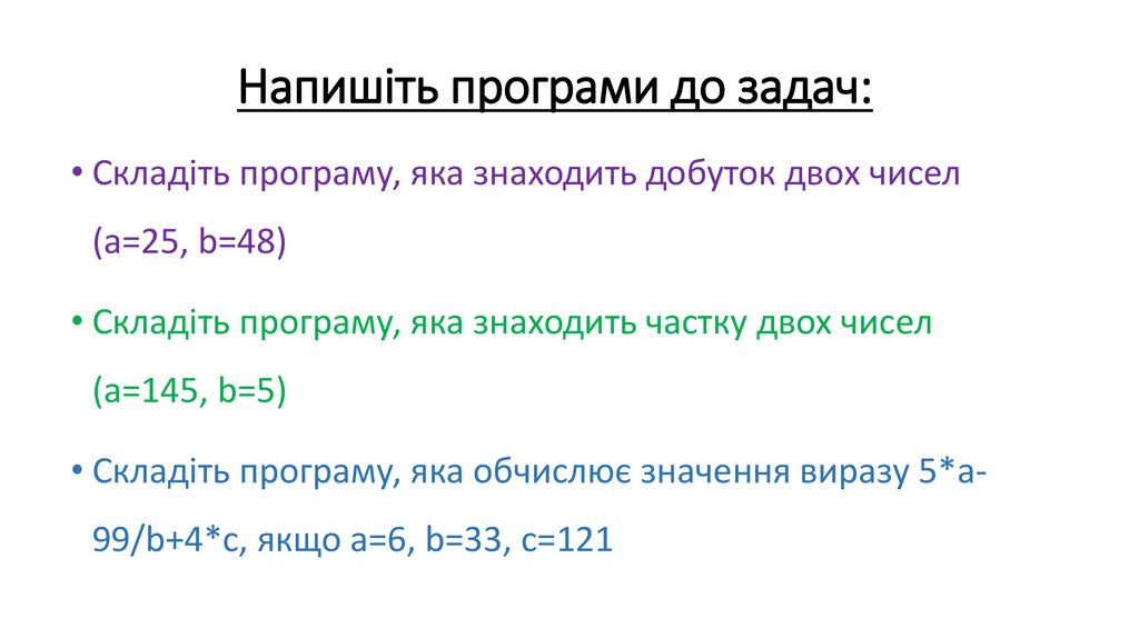 Напишіть програми до задач:• Складіть програму, яка знаходить добуток двох чисел