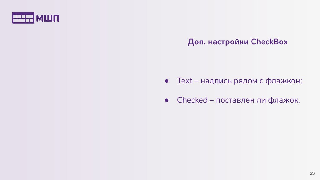 Доп. настройки CheckBoxText – надпись рядом с флажком;