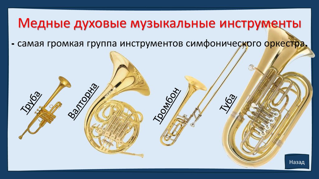 Медные духовые музыкальные инструменты- самая громкая группа инструментов симфонического оркестра.
