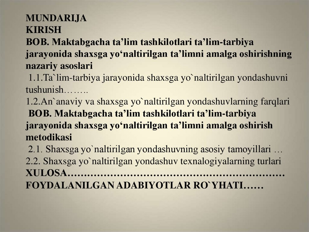 2. MUNDARIJA KIRISH BOB. Maktabgacha ta’lim tashkilotlari ta’lim-tarbiya jarayonida shaxsga yo‘naltirilgan ta’limni amalga