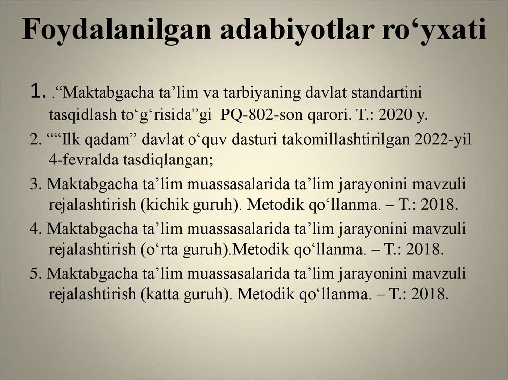 1. .“Maktabgacha ta’lim va tarbiyaning davlat standartinitasqidlash to‘g‘risida”gi PQ-802-son qarori. T.: 2020 y.