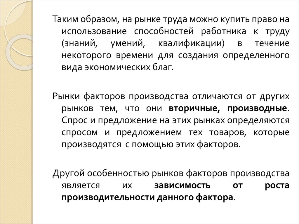 Таким образом, на рынке труда можно купить право наиспользование способностей работника к труду