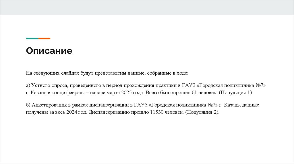 ОписаниеНа следующих слайдах будут представлены данные, собранные в ходе: