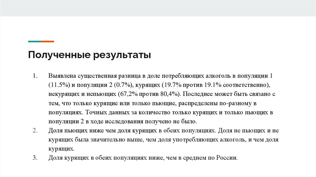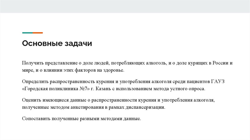 Основные задачиПолучить представление о доле людей, потребляющих алкоголь, и о доле курящих в России и