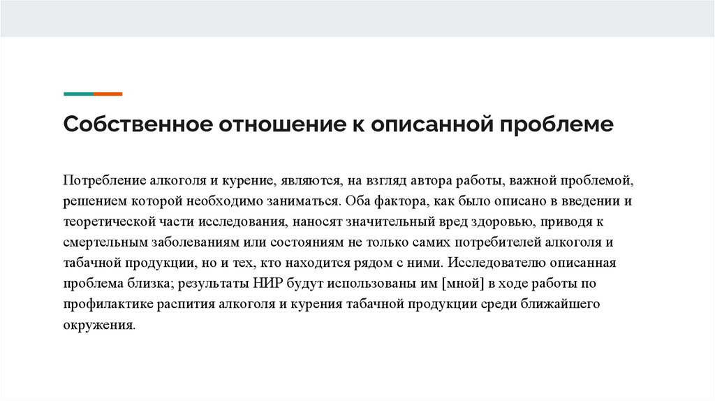 Собственное отношение к описанной проблемеПотребление алкоголя и курение, являются, на взгляд автора работы, важной проблемой,