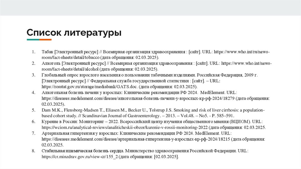 Табак [Электронный ресурс] // Всемирная организация здравоохранения : [сайт]. URL: https://www.who.int/ru/newsroom/fact-sheets/detail/tobacco (дата обращения: 02.03.2025).
