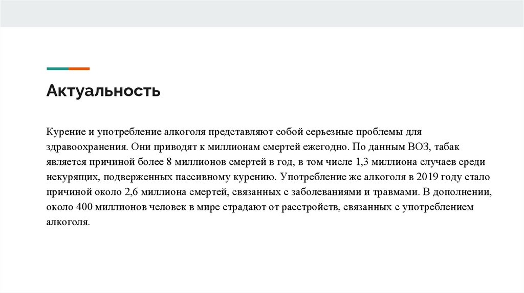 здравоохранения. Они приводят к миллионам смертей ежегодно. По данным ВОЗ, табак