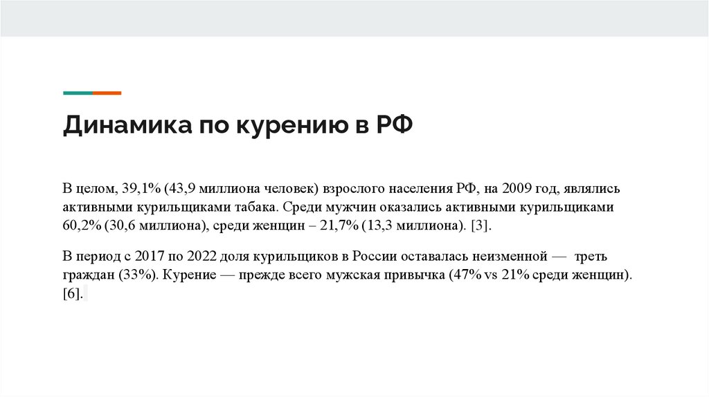 Динамика по курению в РФВ целом, 39,1% (43,9 миллиона человек) взрослого населения РФ, на 2009 год, являлись