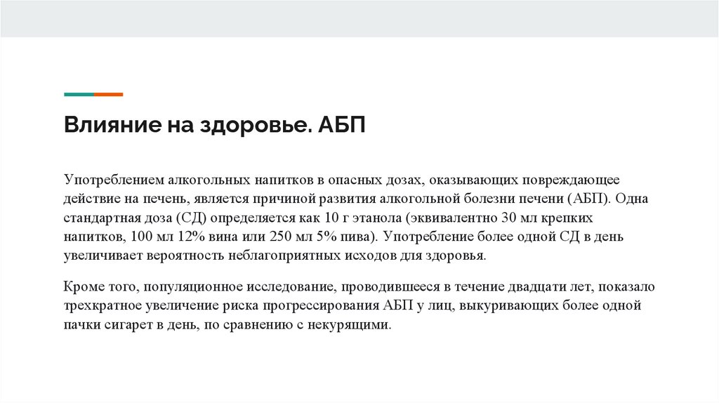 Влияние на здоровье. АБПУпотреблением алкогольных напитков в опасных дозах, оказывающих повреждающее