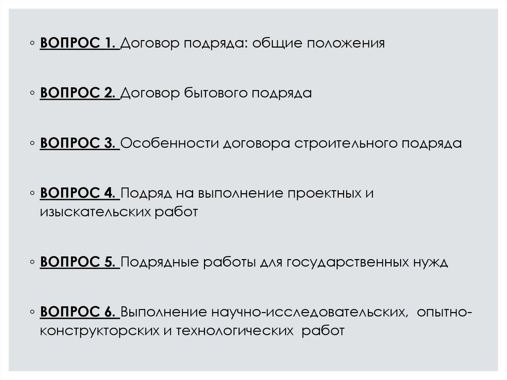 ◦ ВОПРОС 1. Договор подряда: общие положения◦ ВОПРОС 2. Договор бытового подряда