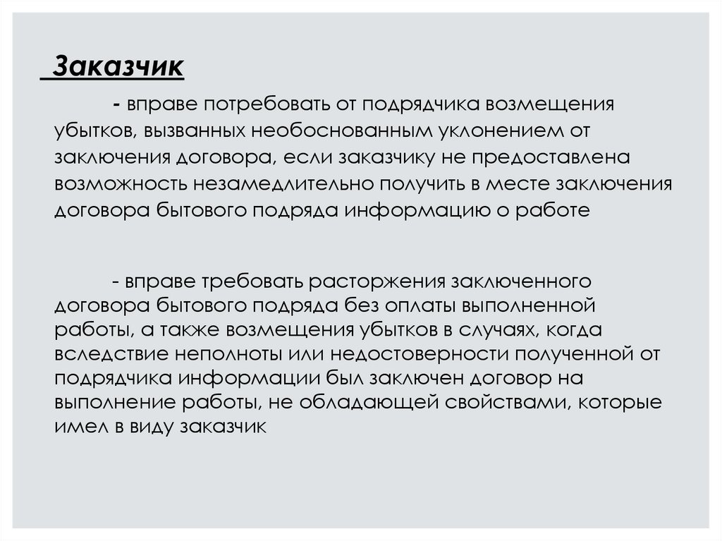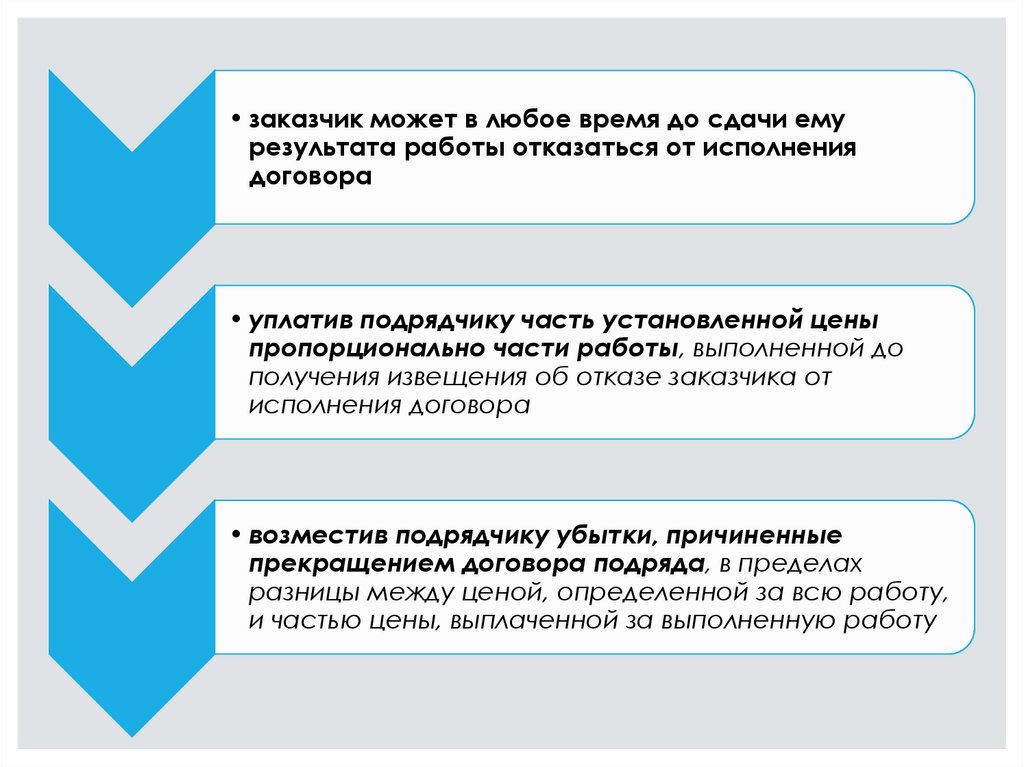• заказчик может в любое время до сдачи емурезультата работы отказаться от исполнения