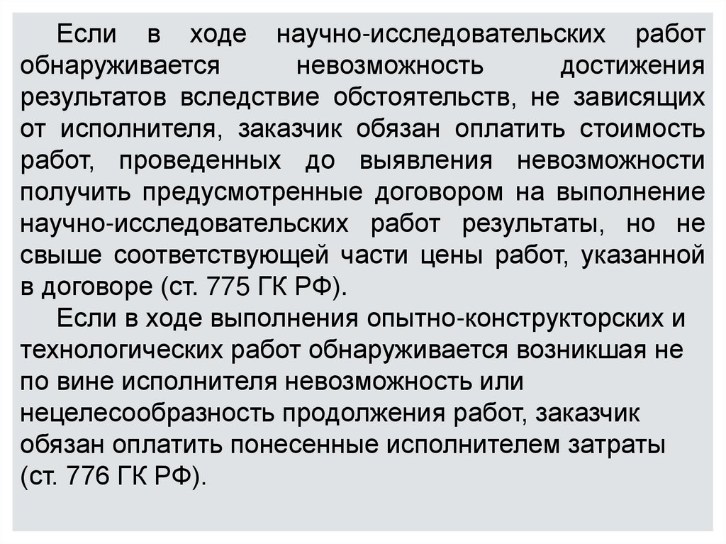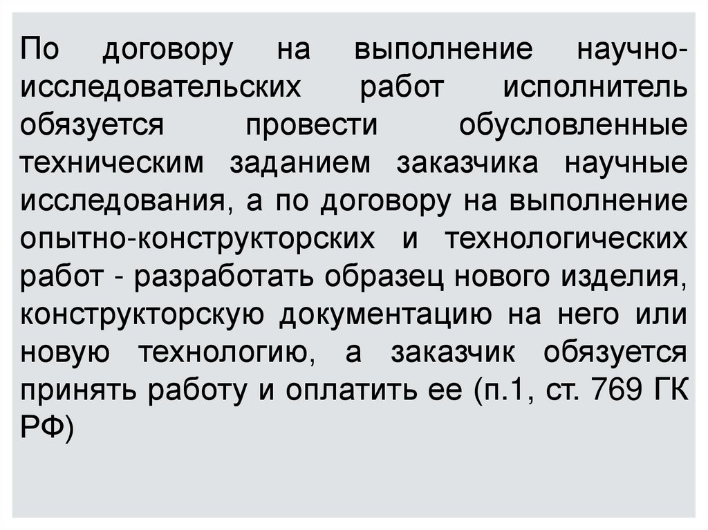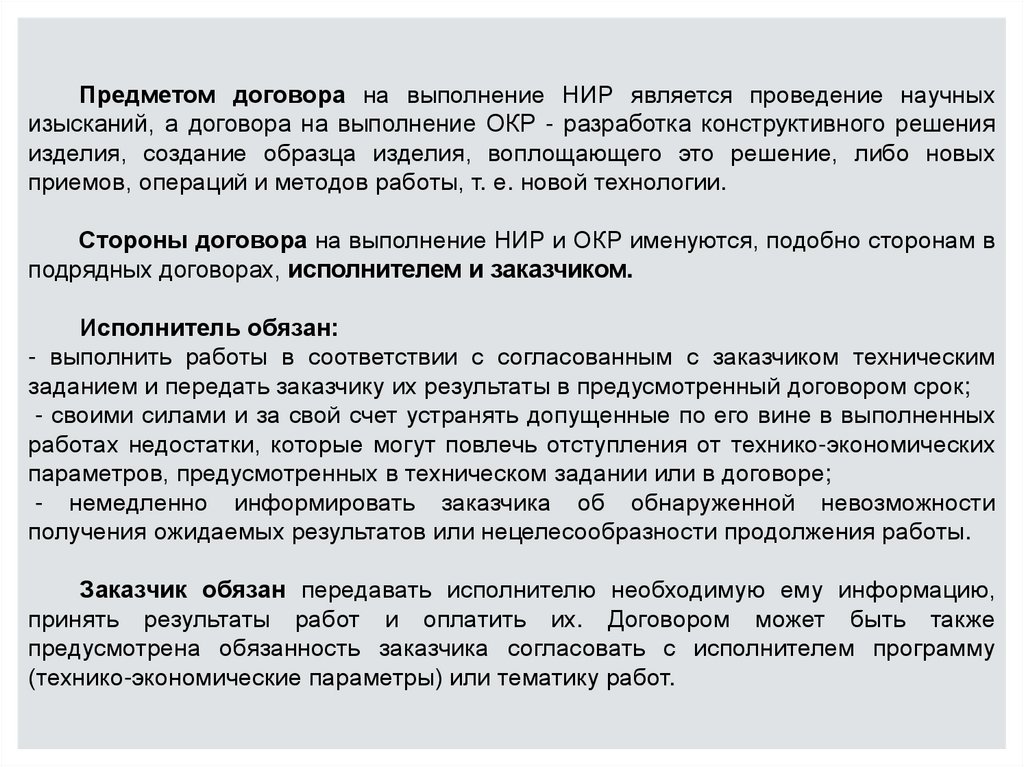 Предметом договора на выполнение НИР является проведение научныхизысканий, а договора на выполнение ОКР - разработка конструктивного решения