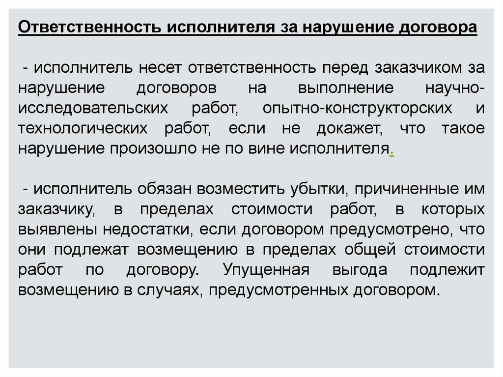 Ответственность исполнителя за нарушение договора- исполнитель несет ответственность перед заказчиком за