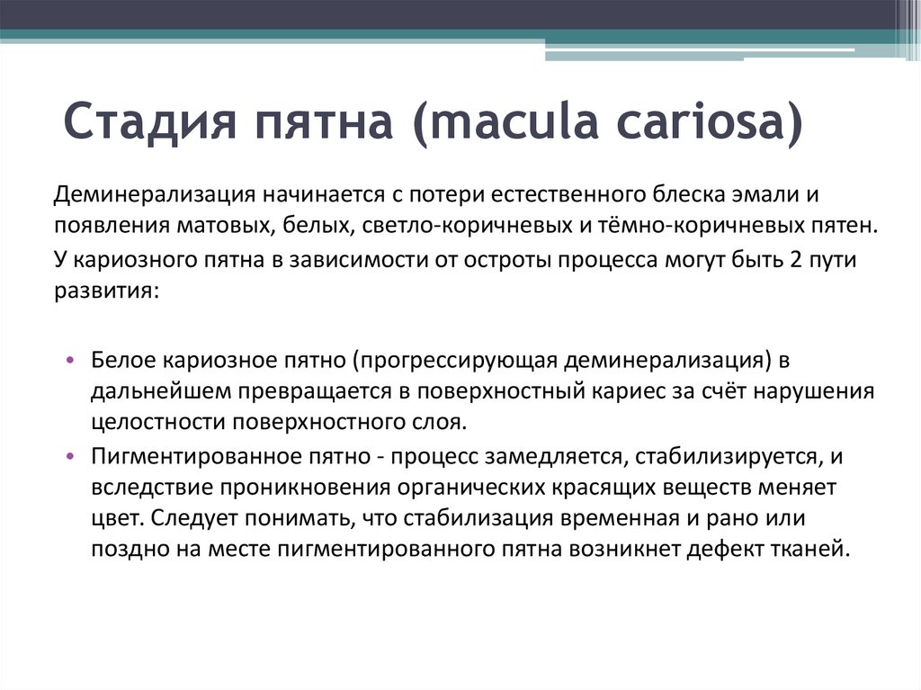 Стадия пятна (macula cariosa)Деминерализация начинается с потери естественного блеска эмали и