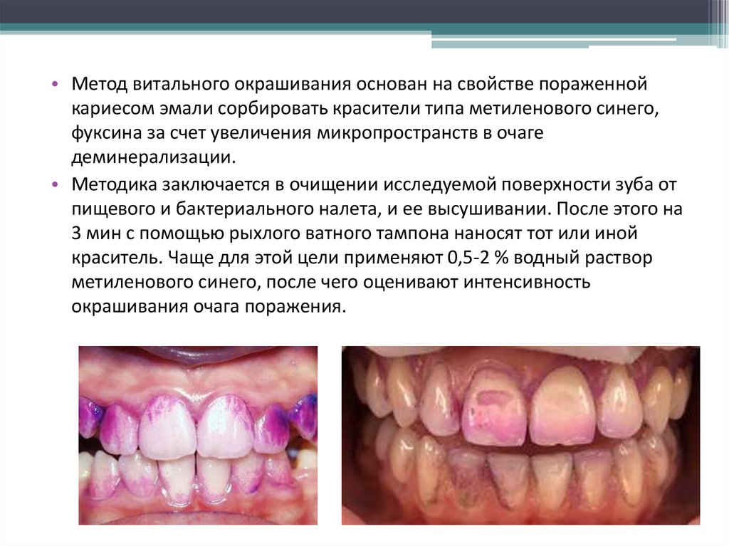 • Метод витального окрашивания основан на свойстве пораженнойкариесом эмали сорбировать красители типа метиленового синего,