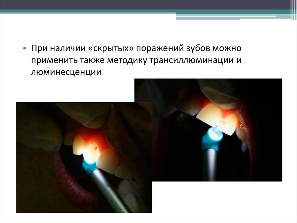 • При наличии «скрытых» поражений зубов можноприменить также методику трансиллюминации и