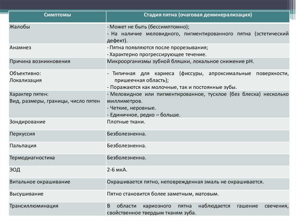 • При этой стадии кариеса жалобы, как правило, отсутствуют. Еслибелое (меловое) или пигментированное (коричневое) пятно