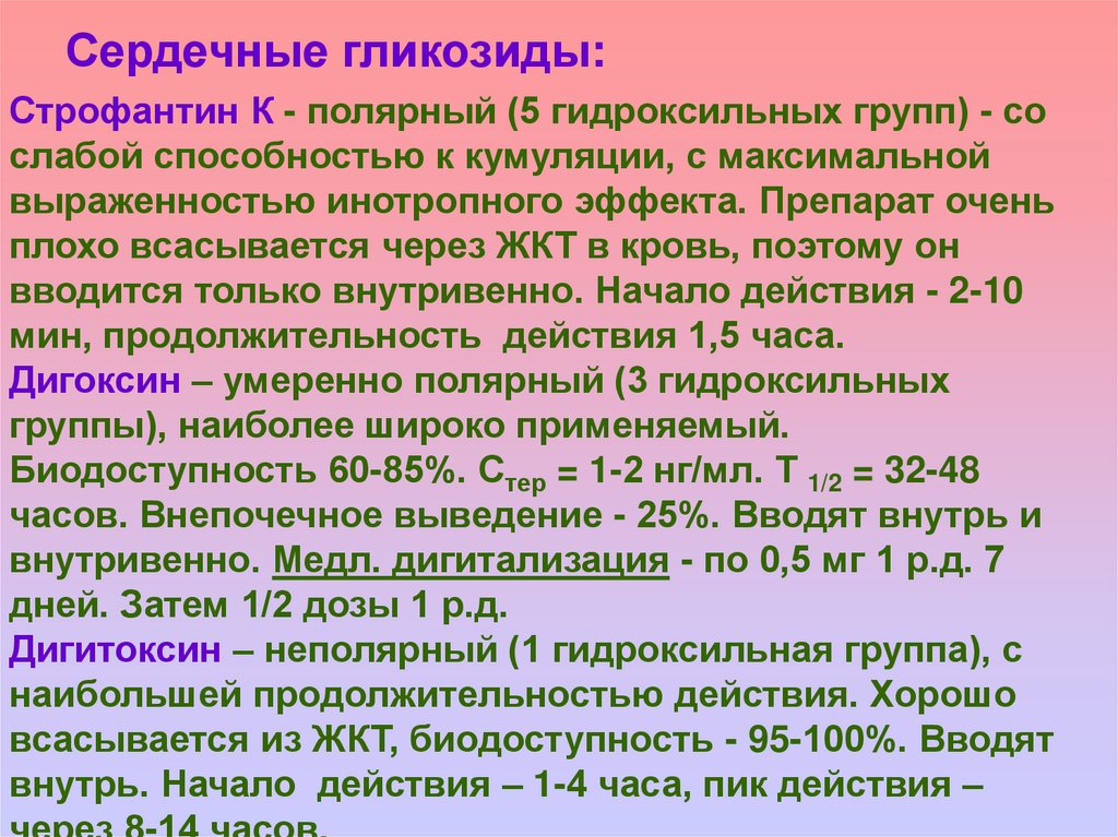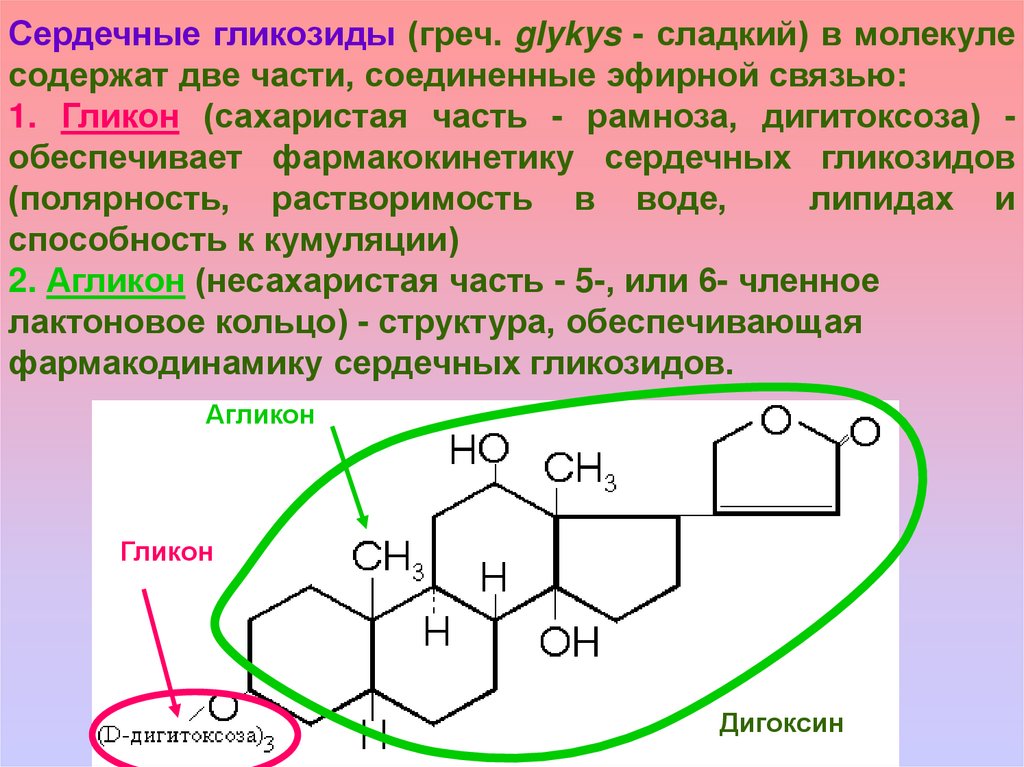 1. Гликон (сахаристая часть - рамноза, дигитоксоза) обеспечивает фармакокинетику сердечных гликозидов