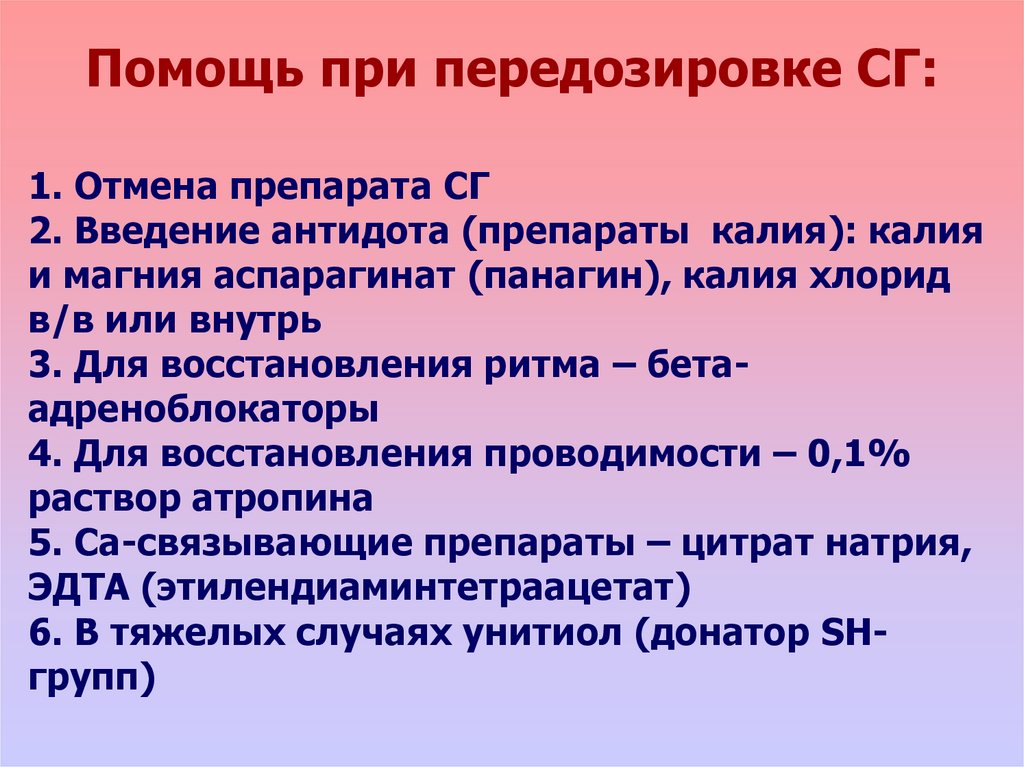 1. Отмена препарата СГ2. Введение антидота (препараты калия): калия