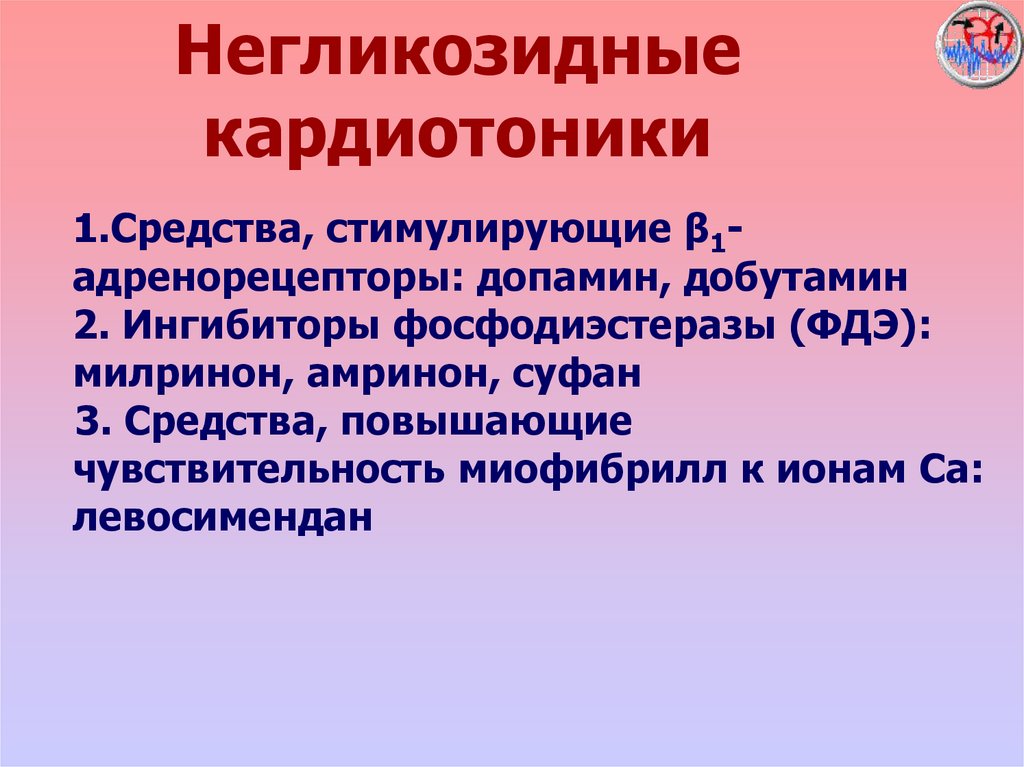 1.Средства, стимулирующие β1адренорецепторы: допамин, добутамин2. Ингибиторы фосфодиэстеразы (ФДЭ):