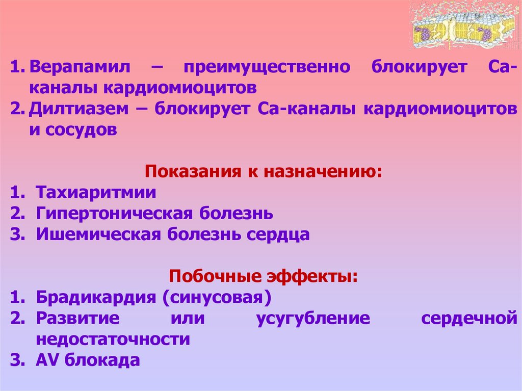 1. Верапамил – преимущественно блокирует Саканалы кардиомиоцитов2. Дилтиазем – блокирует Са-каналы кардиомиоцитов