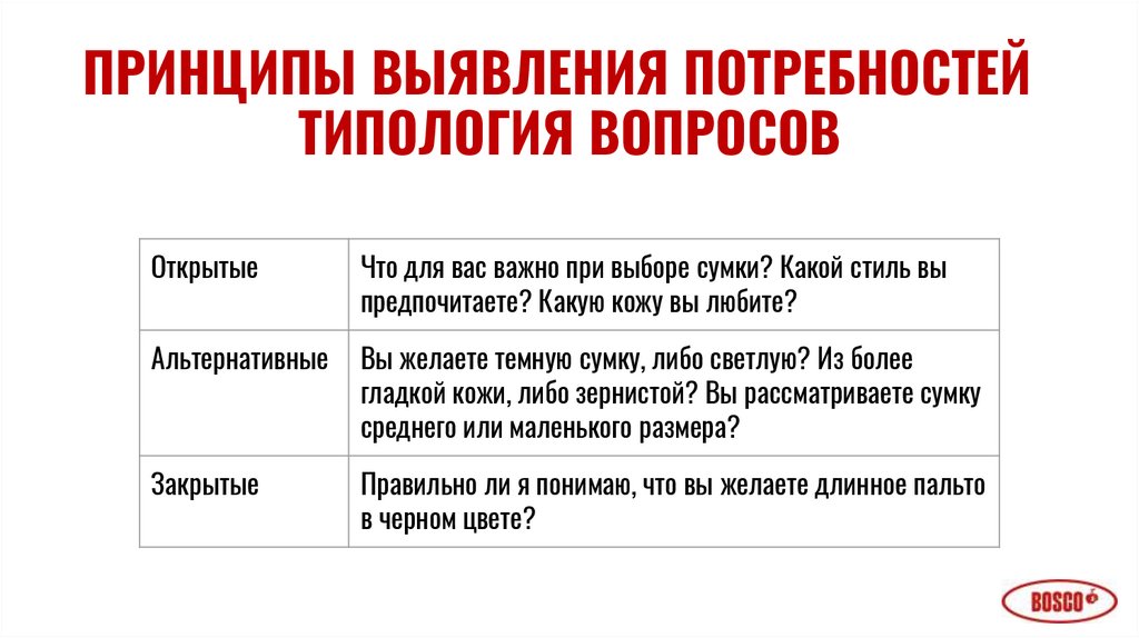ПРИНЦИПЫ ВЫЯВЛЕНИЯ ПОТРЕБНОСТЕЙТИПОЛОГИЯ ВОПРОСОВ