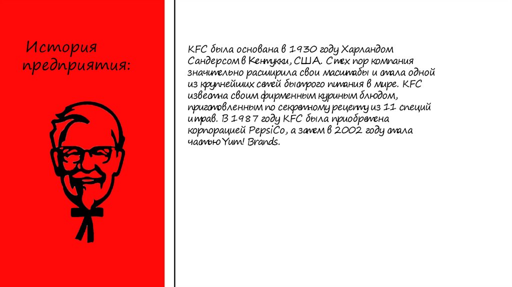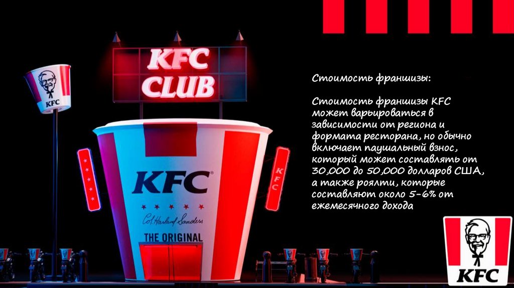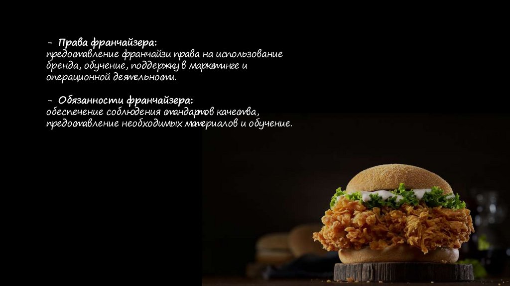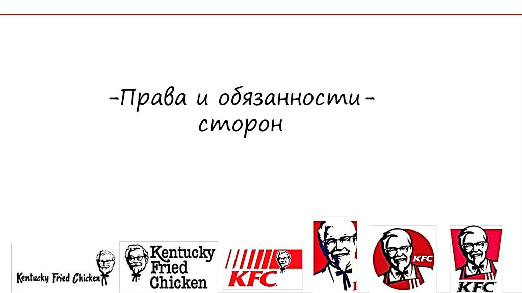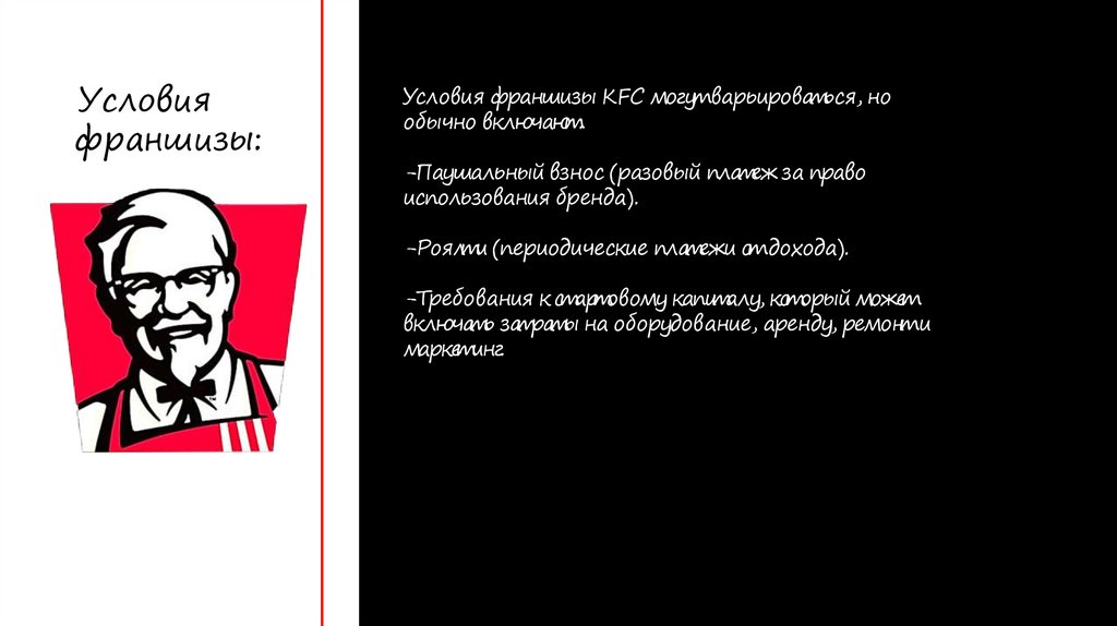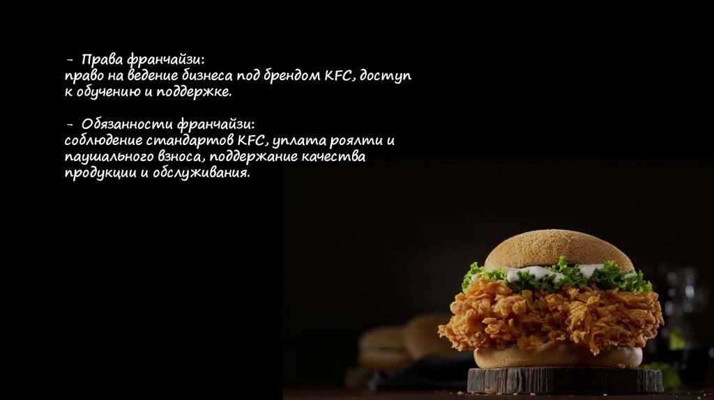 - Права франчайзи:право на ведение бизнеса под брендом KFC, доступ