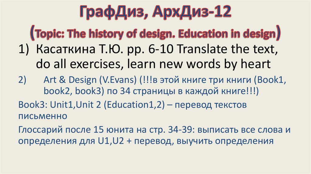 1) Касаткина Т.Ю. pp. 6-10 Translate the text,do all exercises, learn new words by heart