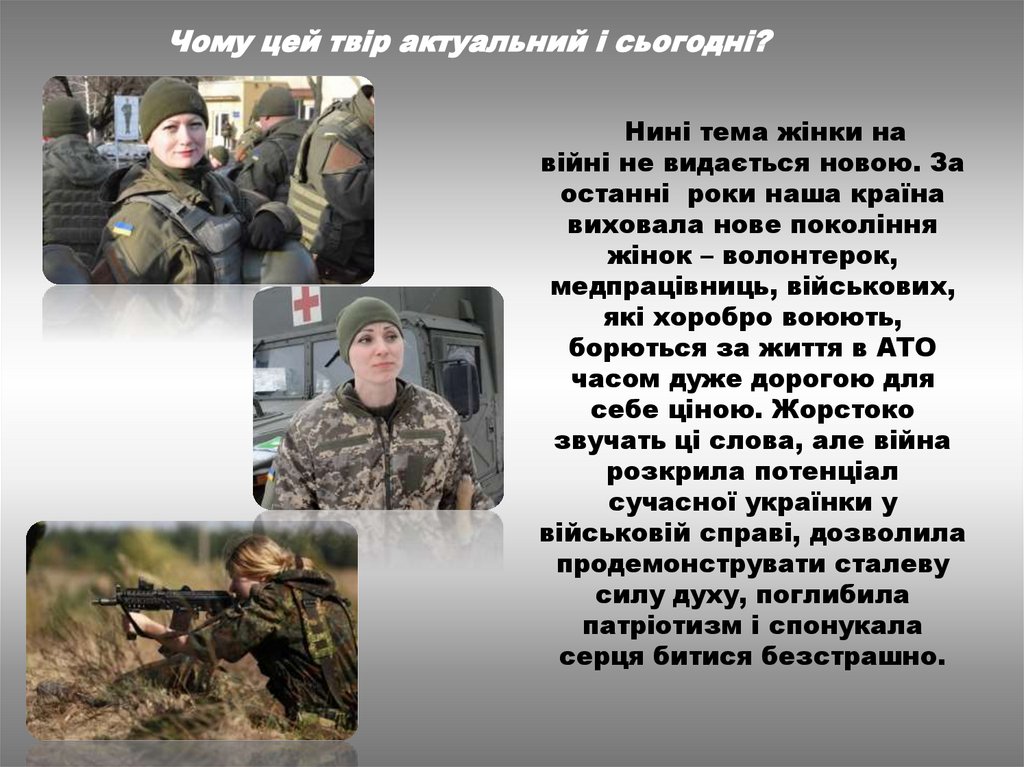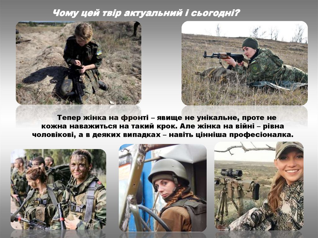 Чому цей твір актуальний і сьогодні?Тепер жінка на фронті – явище не унікальне, проте не