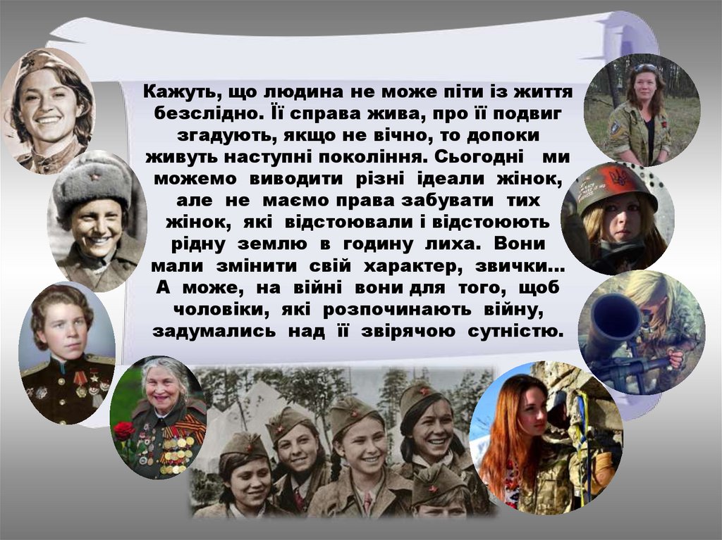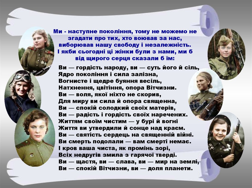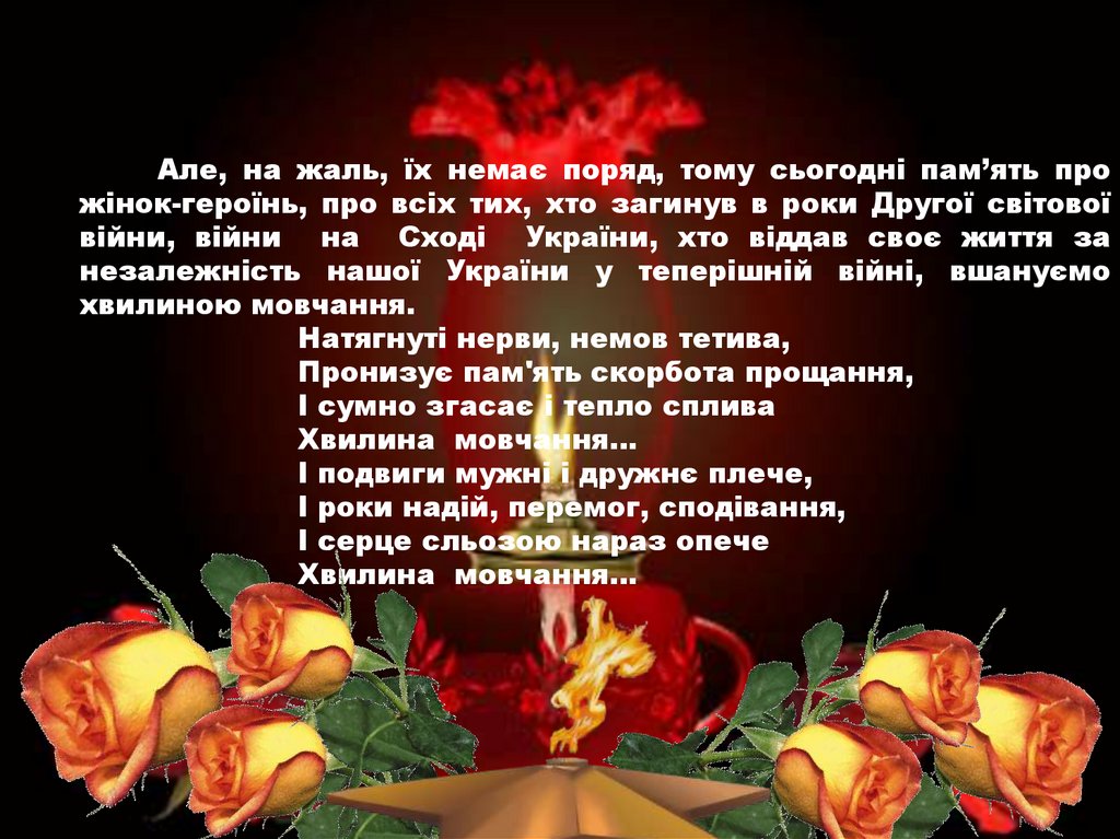 Але, на жаль, їх немає поряд, тому сьогодні пам’ять прожінок-героїнь, про всіх тих, хто загинув в роки Другої світової