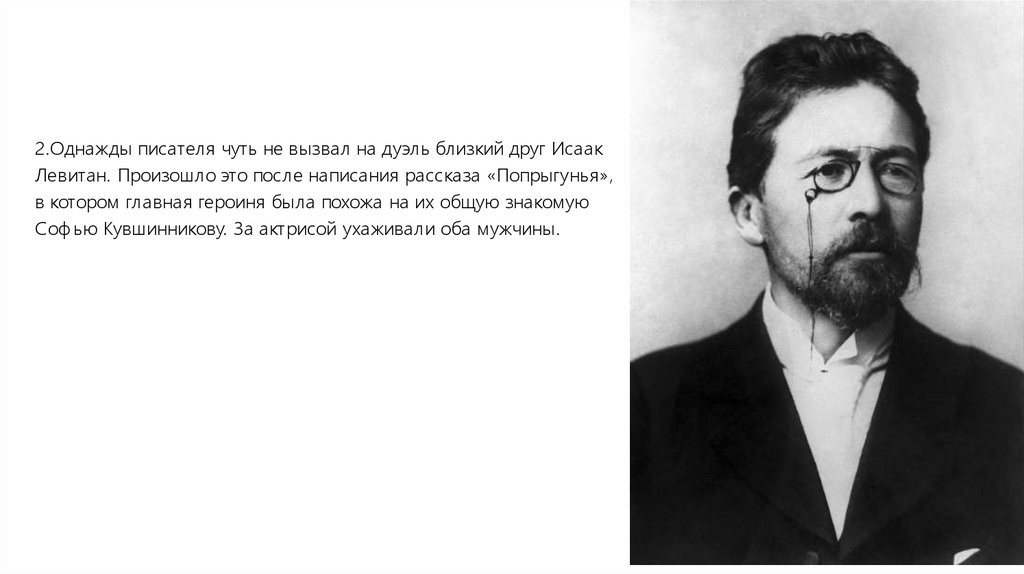 2.Однажды писателя чуть не вызвал на дуэль близкий друг ИсаакЛевитан. Произошло это после написания рассказа «Попрыгунья»,