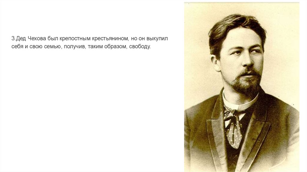 3.Дед Чехова был крепостным крестьянином, но он выкупилсебя и свою семью, получив, таким образом, свободу.