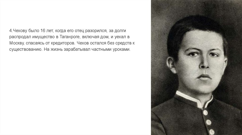 4.Чехову было 16 лет, когда его отец разорился, за долгираспродал имущество в Таганроге, включая дом, и уехал в
