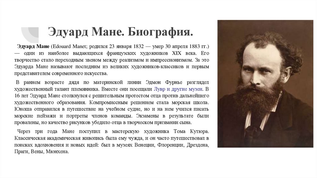 Эдуард Мане. Биография.Эдуард Мане (Edouard Manet; родился 23 января 1832 — умер 30 апреля 1883 гг.)