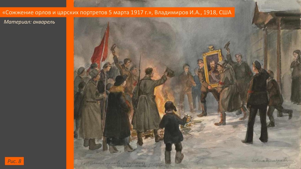 «Сожжение орлов и царских портретов 5 марта 1917 г.», Владимиров И.А., 1918, СШАМатериал: акварель