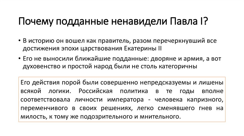 Почему подданные ненавидели Павла I?• В историю он вошел как правитель, разом перечеркнувший все