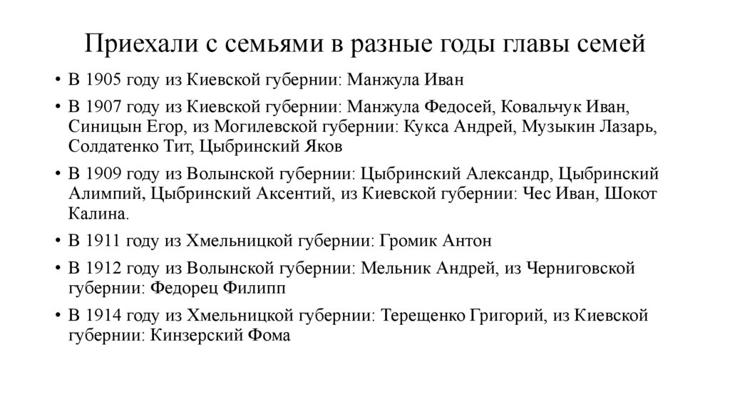 Приехали с семьями в разные годы главы семей• В 1905 году из Киевской губернии: Манжула Иван