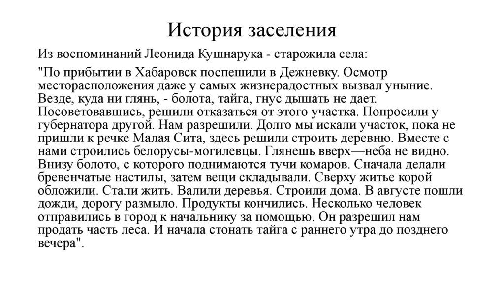 История заселенияИз воспоминаний Леонида Кушнарука - старожила села: