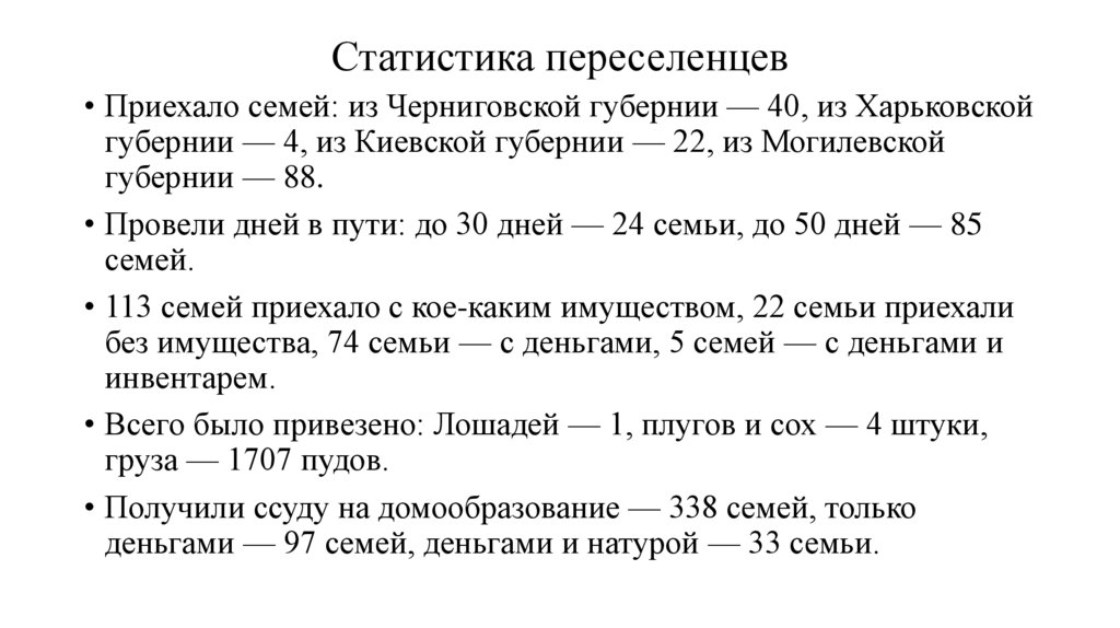 Статистика переселенцев• Приехало семей: из Черниговской губернии — 40, из Харьковской