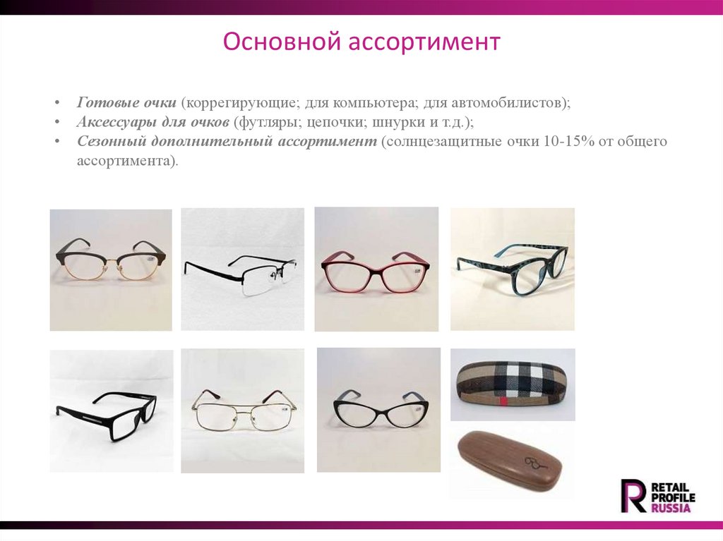 Основной ассортиментГотовые очки (коррегирующие; для компьютера; для автомобилистов);