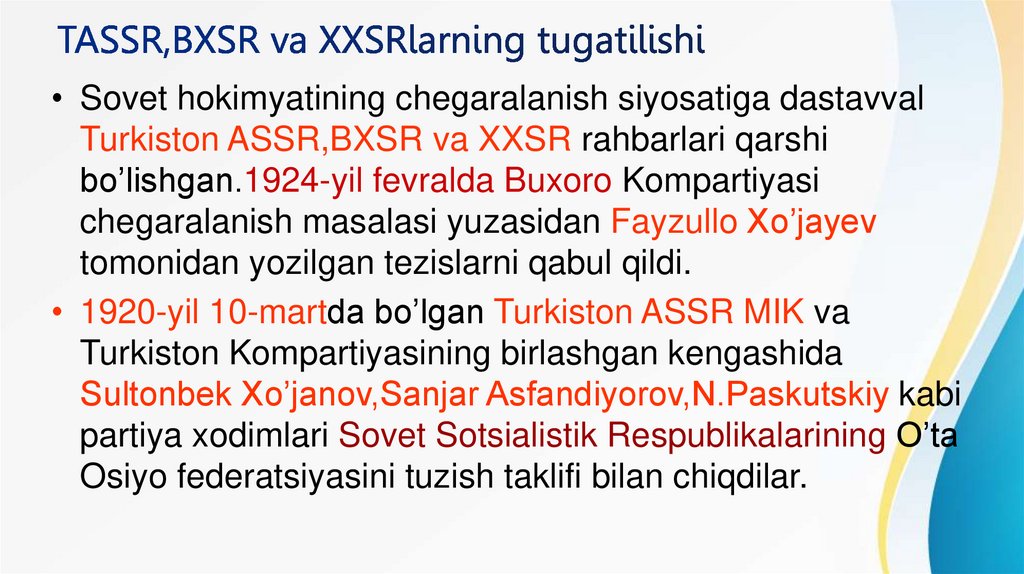 • Sovet hokimyatining chegaralanish siyosatiga dastavvalTurkiston ASSR,BXSR va XXSR rahbarlari qarshi