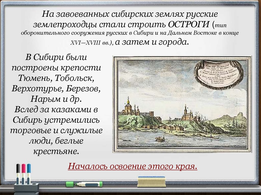 территориях русские строили укреплённые крепостиостроги. Началось освоение обширного сибирского