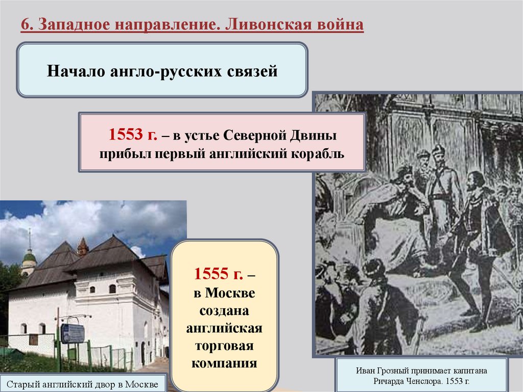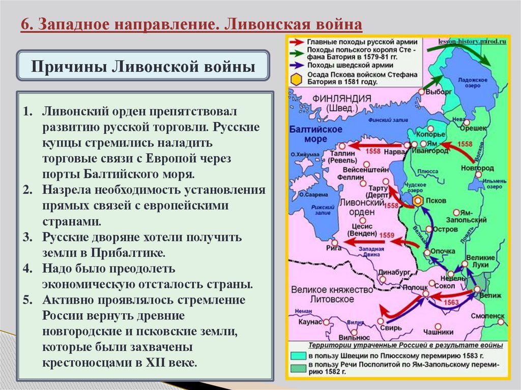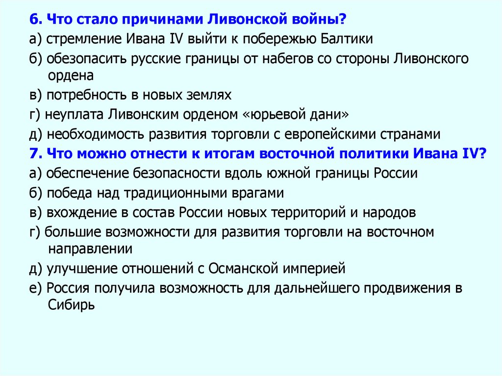 6. Что стало причинами Ливонской войны?а) стремление Ивана IV выйти к побережью Балтики