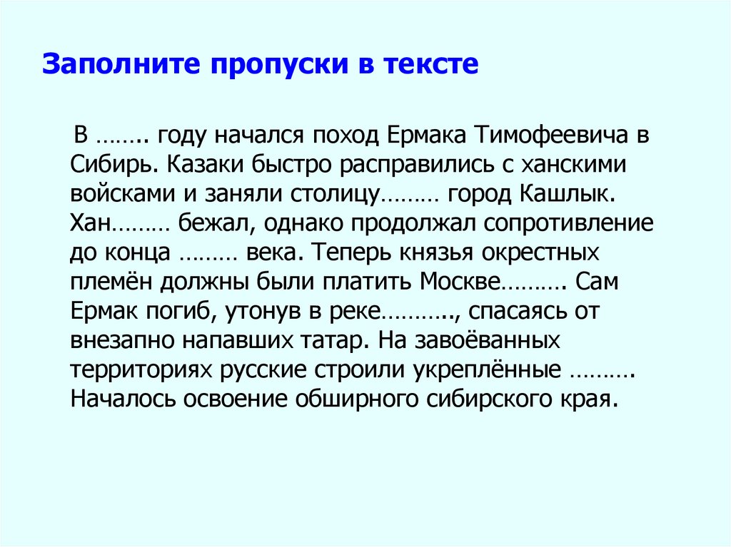 Заполните пропуски в текстеВ 1581 году начался поход Ермака Тимофеевича в