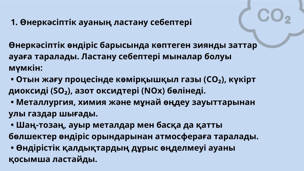 1. Өнеркәсіптік ауаның ластану себептеріӨнеркәсіптік өндіріс барысында көптеген зиянды заттар