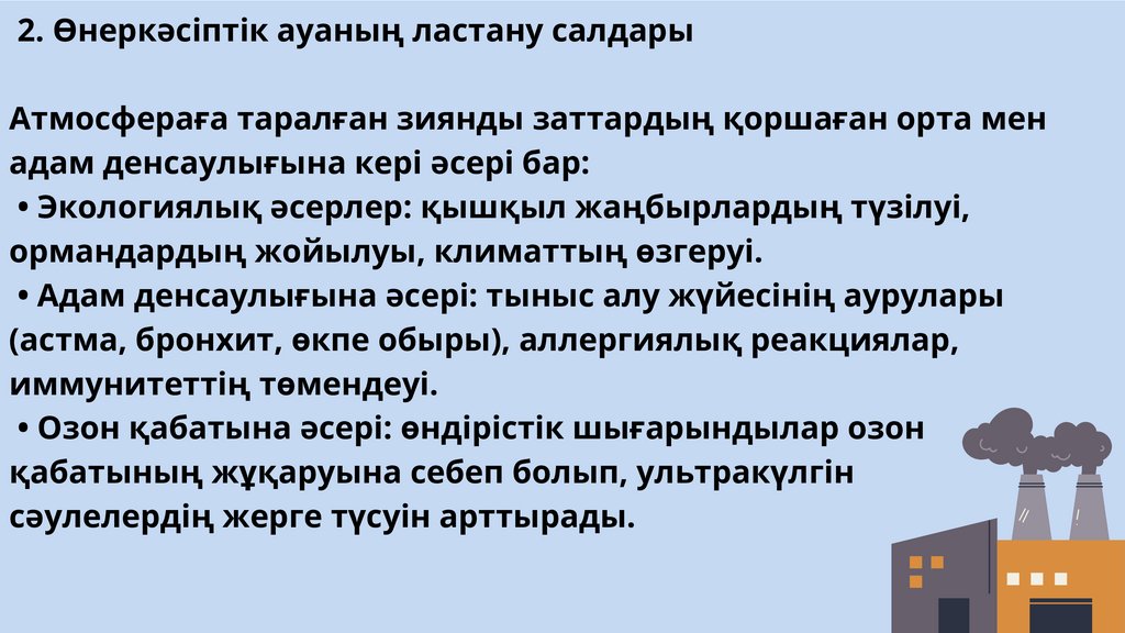 2. Өнеркәсіптік ауаның ластану салдарыАтмосфераға таралған зиянды заттардың қоршаған орта мен
